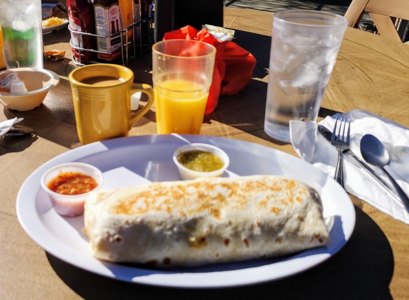 Es ging los mit einem 1 1/2 stündigen Marsch zum Paradise Valley Cafe. Ich hatte nichts gefrühstückt, da ich dies im Café tun wollte. Pünktlich kurz vor 8 im Café angekommen, warteten schon um die 25 hungrige Hiker vor der Tür. Es ging dann gaz flott und die eingespielte Crew hatte bald alle schon mal mit Kaffee versorgt. Essen bestellen und nach 30 Minuten wurde geliefert. Das Teil (Buritto) sah so aus: