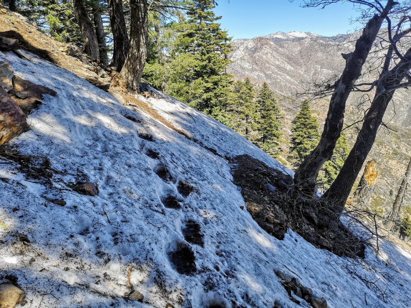 Nach dem Mittagessen dann der Abstieg auf der Nordwest SeiteDes San Jacinto. Sagen wirs mal so, es gab auch schöne Abschnitte. Zu den anderen gehörte eine Traverse in einem bewaldeten Nordhang alles voller Schnee von der nassen Sorte. Nach 1 1/2 Stunden nahm die Traverse doch noch ein Ende. Dafür entschädigte das letzte Stück Trail bis zum Campground. Es war wie eine Filmkulisse.